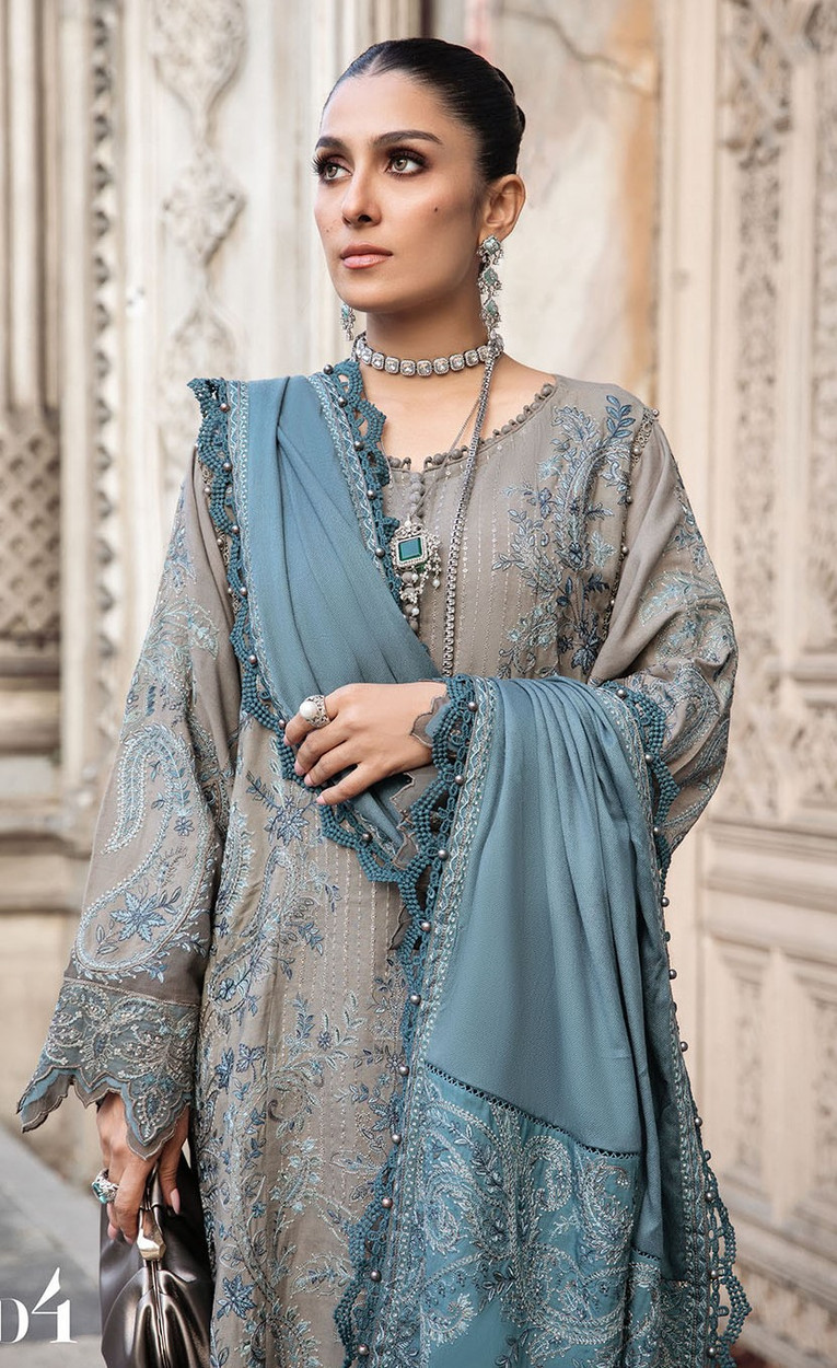This dress is a symphony of elegance; featuring an embroidered shirt framed with organza and paired with embroidered shawl and dyed trousers.